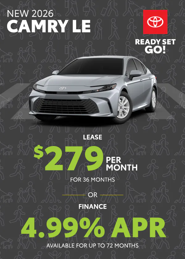 Finance: 4.99% APR available on select new 2026 Toyota Camry LE models for up to 72 months ($16.10 per $1,000 financed). On approved credit to qualified buyers.
