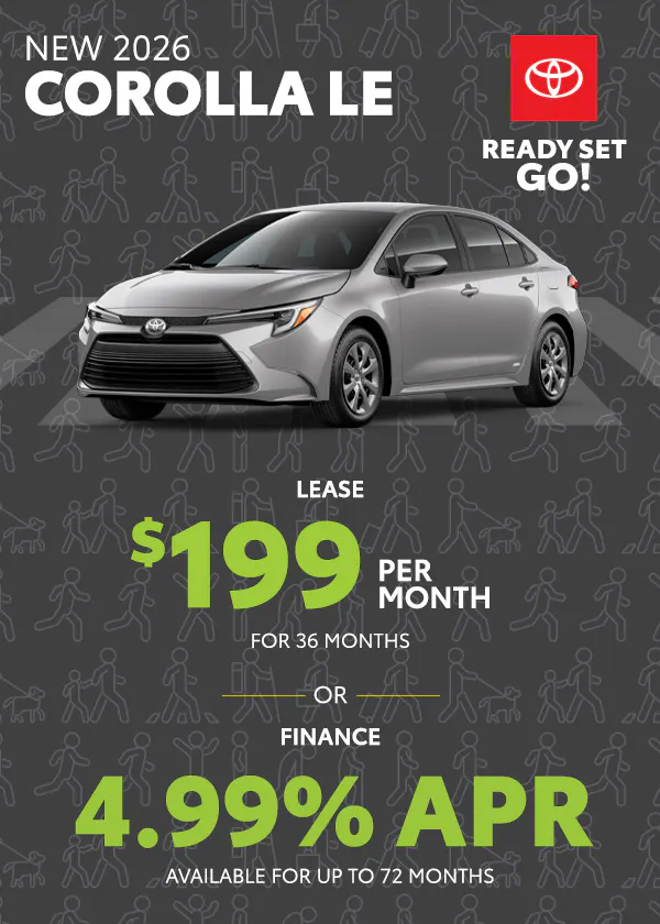 Finance: 4.99% APR available on select new 2026 Toyota Corolla LE models for up to 72 months ($16.10 per $1,000 financed). On approved credit to qualified buyers.