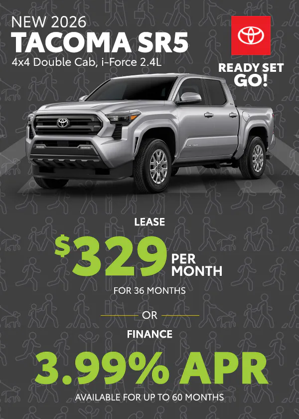 Finance: 3.99% APR available on select new 2026 Toyota Tacoma SR5 models for up to 60 months ($18.41 per $1,000 financed). On approved credit to qualified buyers. Includes $500 APR Subvention Cash.