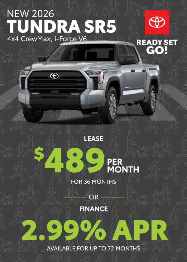Finance: 2.99% APR available on select new 2026 Toyota Tundra SR5 models for up to 60 months ($15.19 per $1,000 financed). On approved credit to qualified buyers. Includes $3,000 Rebate or $1,000 APR Subvention Cash with Special Finance Rate.