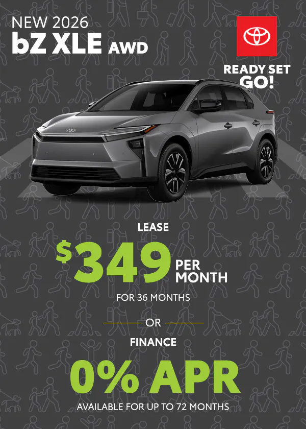 Finance: 0% APR available on select new 2026 Toyota bZ XLE models for up to 72 months ($13.89 per $1,000 financed). On approved credit to qualified buyers.
