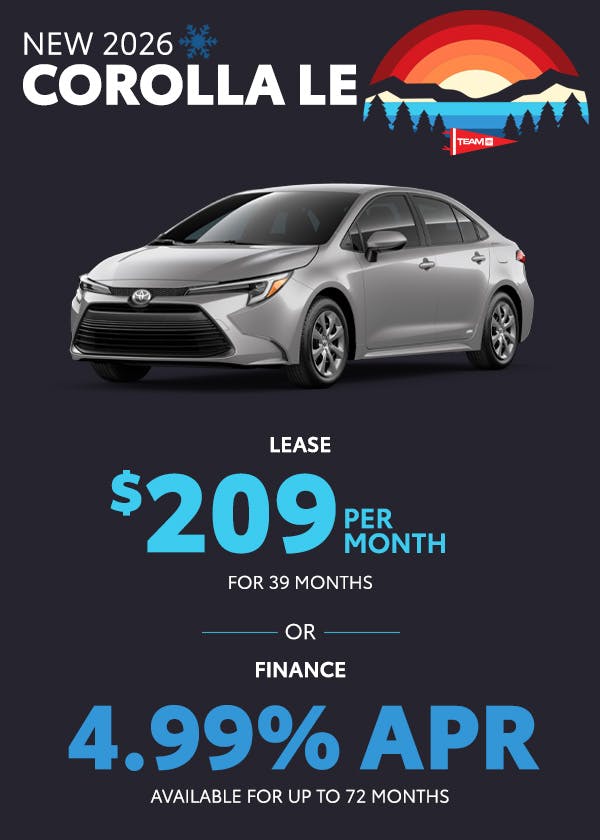 Finance: 4.99% APR available on select new 2026 Toyota Corolla LE models for up to 72 months ($16.10 per $1,000 financed). On approved credit to qualified buyers.