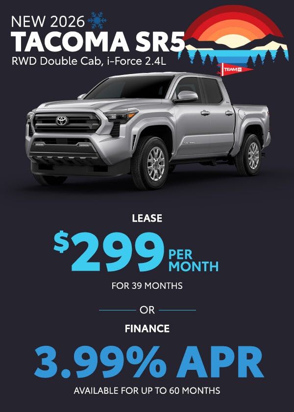 Finance: 3.99% APR available on select new 2026 Toyota Tacoma SR5 models for up to 60 months ($18.41 per $1,000 financed). On approved credit to qualified buyers.