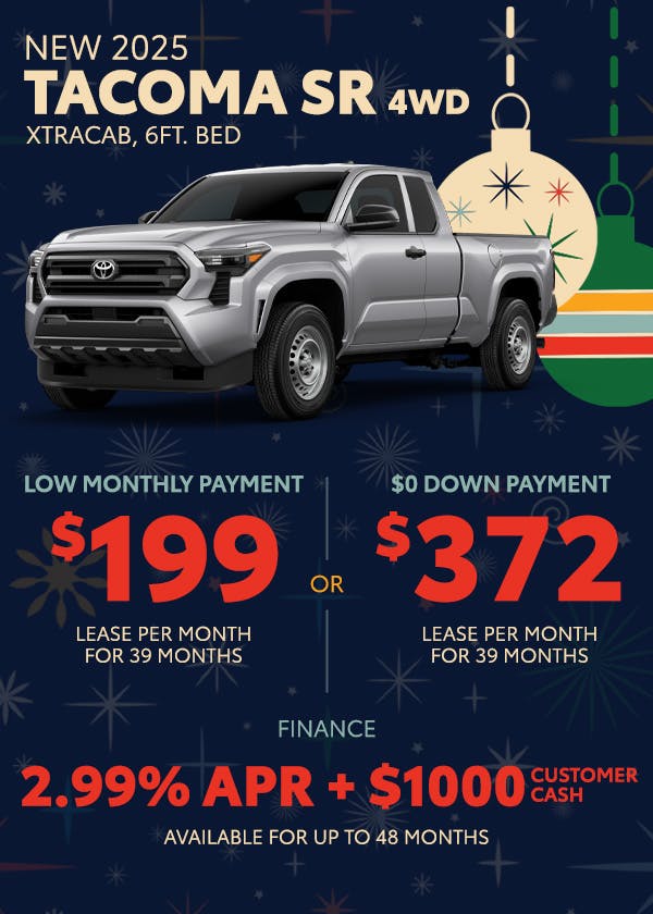 TSRP $31,012 *With approved credit from Toyota Financial Services. 36 MONTH LEASE: $315 per month with $3,942 due at signing ($315 first payment + $0 security deposit + $2,500 down payment + $650 bank fee + $477 doc fee) Residual: $21,088. Tax, tags & title not included in lease offer. Customer responsible for maintenance, excess wear and tear and $0.15/mile over 10,000 miles per year per lease offer. Offer expires 12/01/2025.