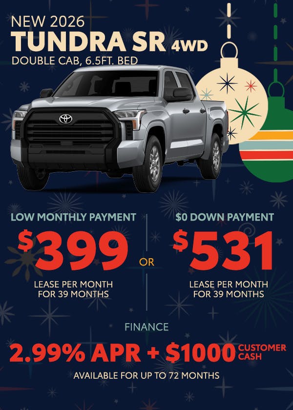 TSRP $44,053 *With approved credit from Toyota Financial Services. 39 MONTH LEASE: $311 per month with $3,438 due at signing ($311 first payment + $0 security deposit + $2,000 down payment + $650 bank fee + $477 doc fee) Residual: $33,480. Tax, tags & title not included in lease offer. Customer responsible for maintenance, excess wear and tear and $0.15/mile over 10,000 miles per year per lease offer. Offer expires 12/01/2025.
