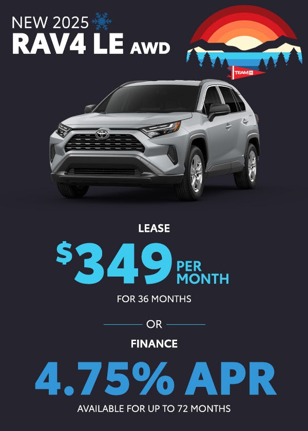 Finance: 4.75% APR available on select new 2025 Toyota Rav4 LE models for up to 72 months ($18.76 per $1,000 financed). On approved credit to qualified buyers.