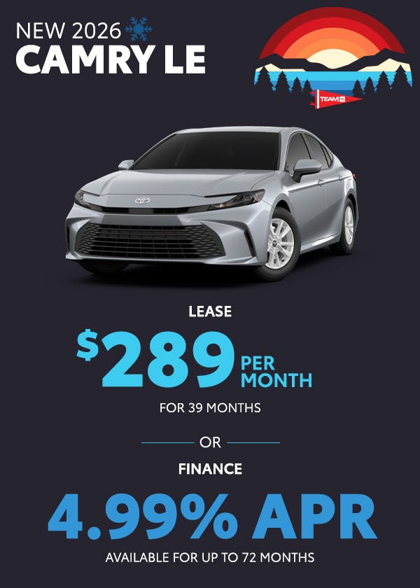 Finance: 4.99% APR available on select new 2026 Toyota Camry LE models for up to 72 months ($16.10 per $1,000 financed). On approved credit to qualified buyers.